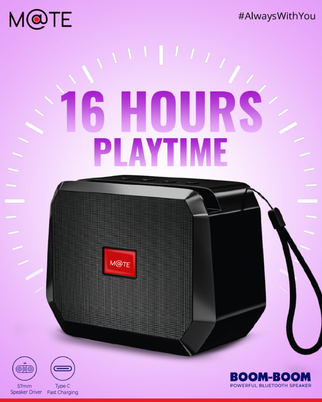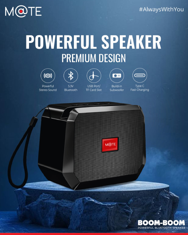Mate Boom Boom Speaker, Up to 5 Hours Of Playtime, Bluetooth 5.3v, USB Charging(DC 5V), Built-in FM radio, 10w Output Power, SD/TF Card Support, 10m Effective Dist, Phone stand, Powerful Bass.